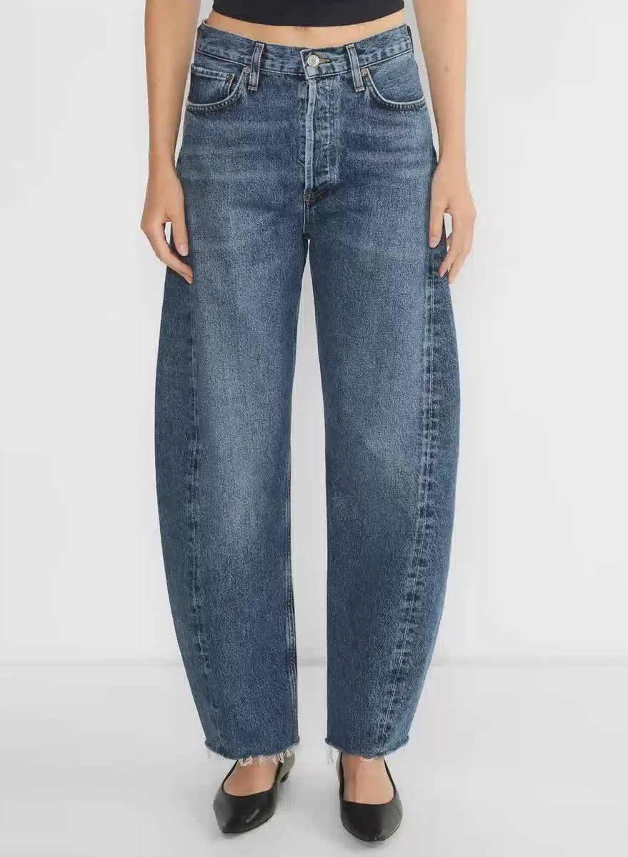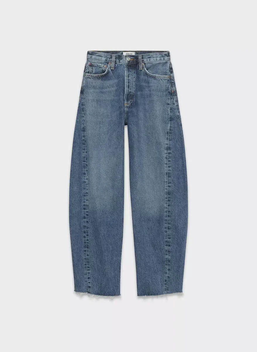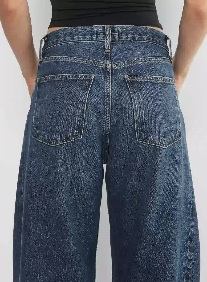 Ce jean taille haute présente une silhouette à jambes arquées, une longueur totale et des empiècements. Il est confectionné dans un coton régénératif épais et non extensible qui s’assouplit au fil des lavages. Ce modèle est disponible dans un délavage indigo foncé vintage avec des effets délavés et des moustaches prononcés, et présente un ourlet brut.p>