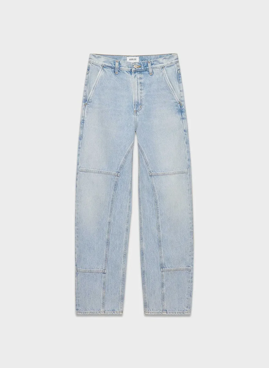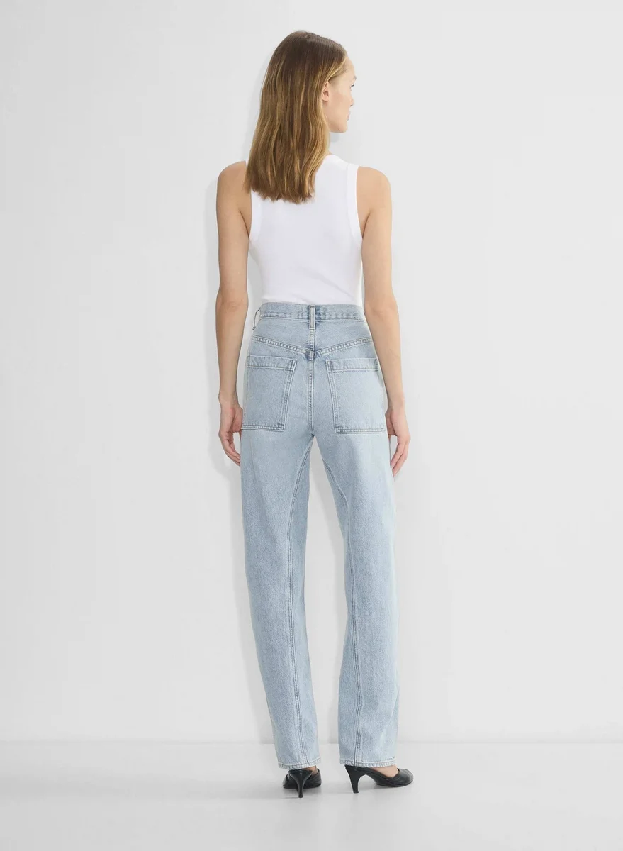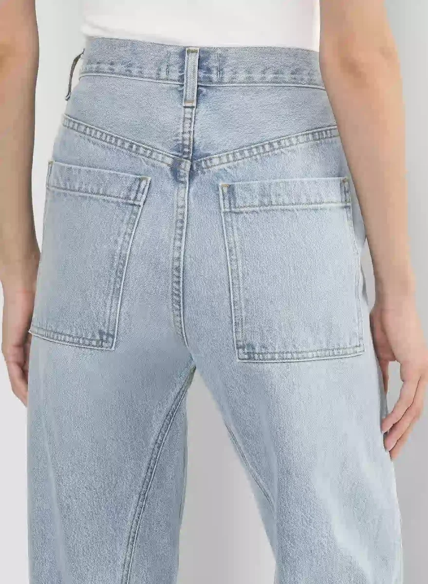 Ce jean est soigné dans les moindres détails. Il s’agit d’un jean ample taille haute à jambes fuselées, avec des empiècements et des coutures détaillées. Il est confectionné dans un coton régénératif et recyclé rigide et non extensible, au toucher doux. Cette version est disponible dans un délavage indigo moyen usé.