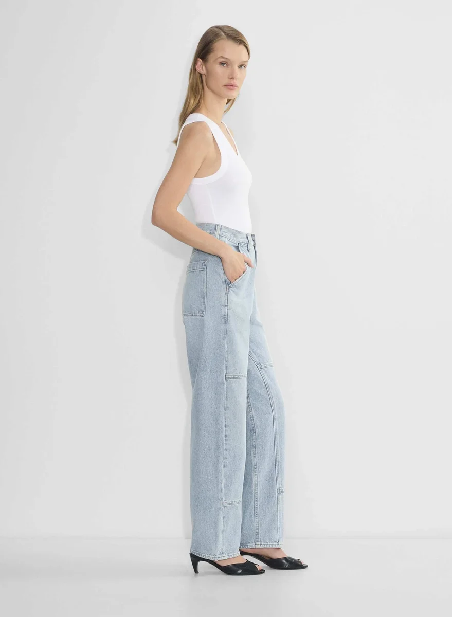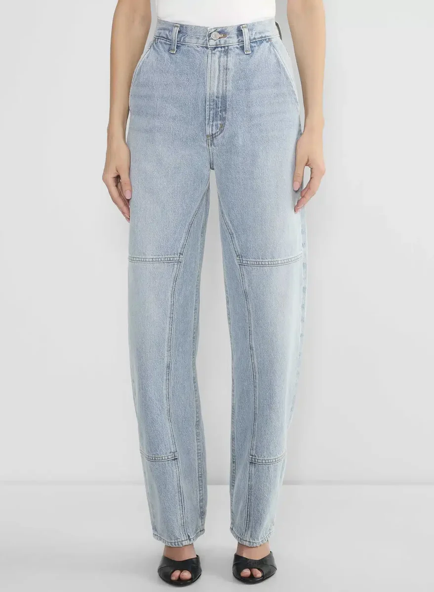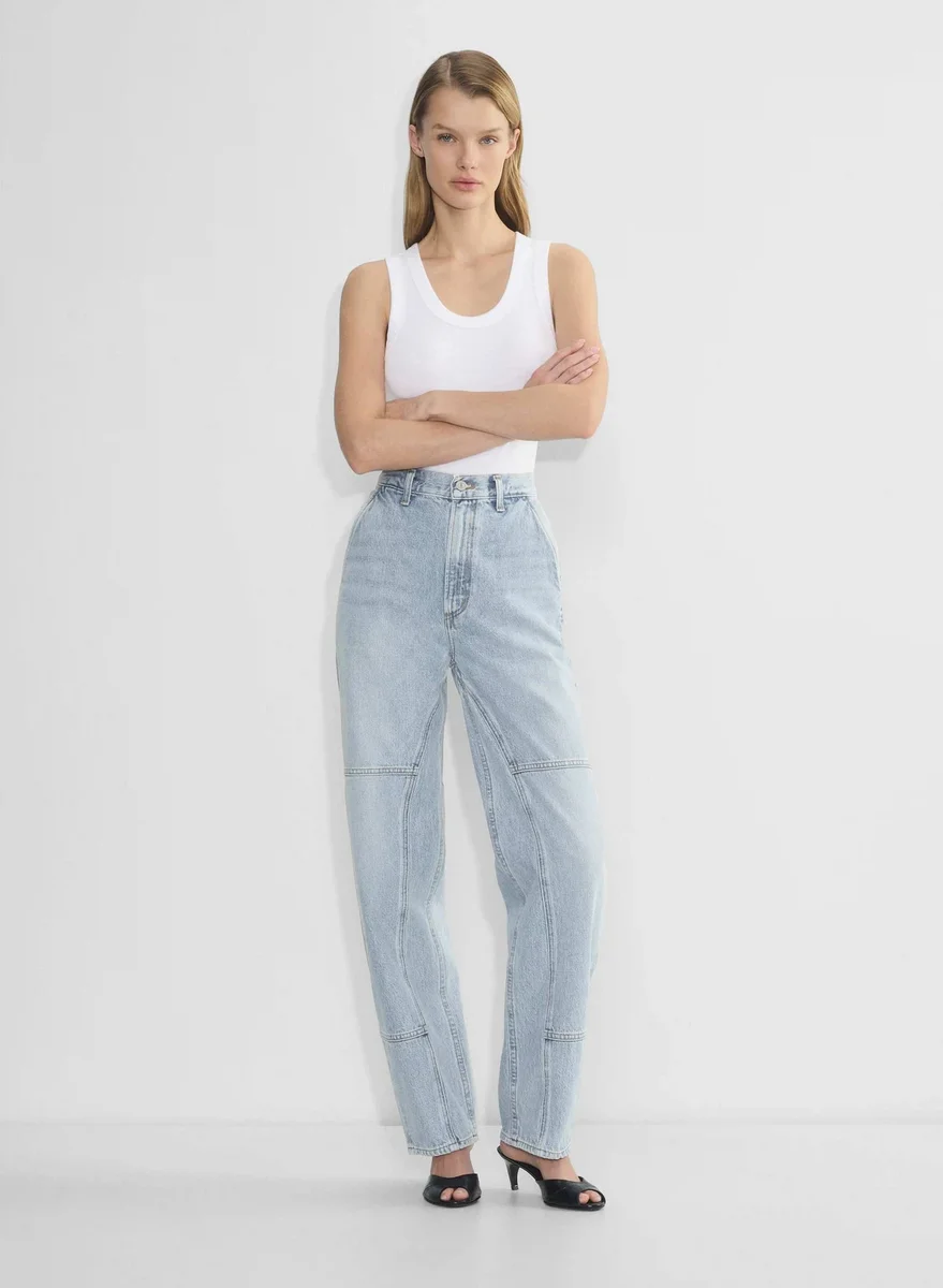 Ce jean est soigné dans les moindres détails. Il s’agit d’un jean ample taille haute à jambes fuselées, avec des empiècements et des coutures détaillées. Il est confectionné dans un coton régénératif et recyclé rigide et non extensible, au toucher doux. Cette version est disponible dans un délavage indigo moyen usé.