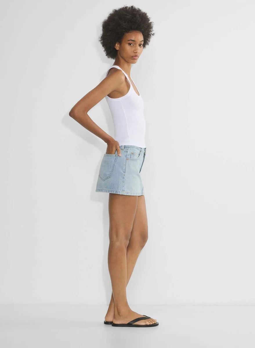 Denim minimalisteInspirée par la pièce parfaite des années 90, la Vintage Micro présente une taille mi-haute et une silhouette classique qui arrive au niveau de la cuisse. Elle est coupée dans un denim épais et non extensible qui s’adapte à votre corps au fil du temps. Ce tissu provient d’une usine italienne de premier plan et est fabriqué à partir de coton régénératif certifié Regenagri à 100 %. Cette version est disponible dans un délavage indigo clair.