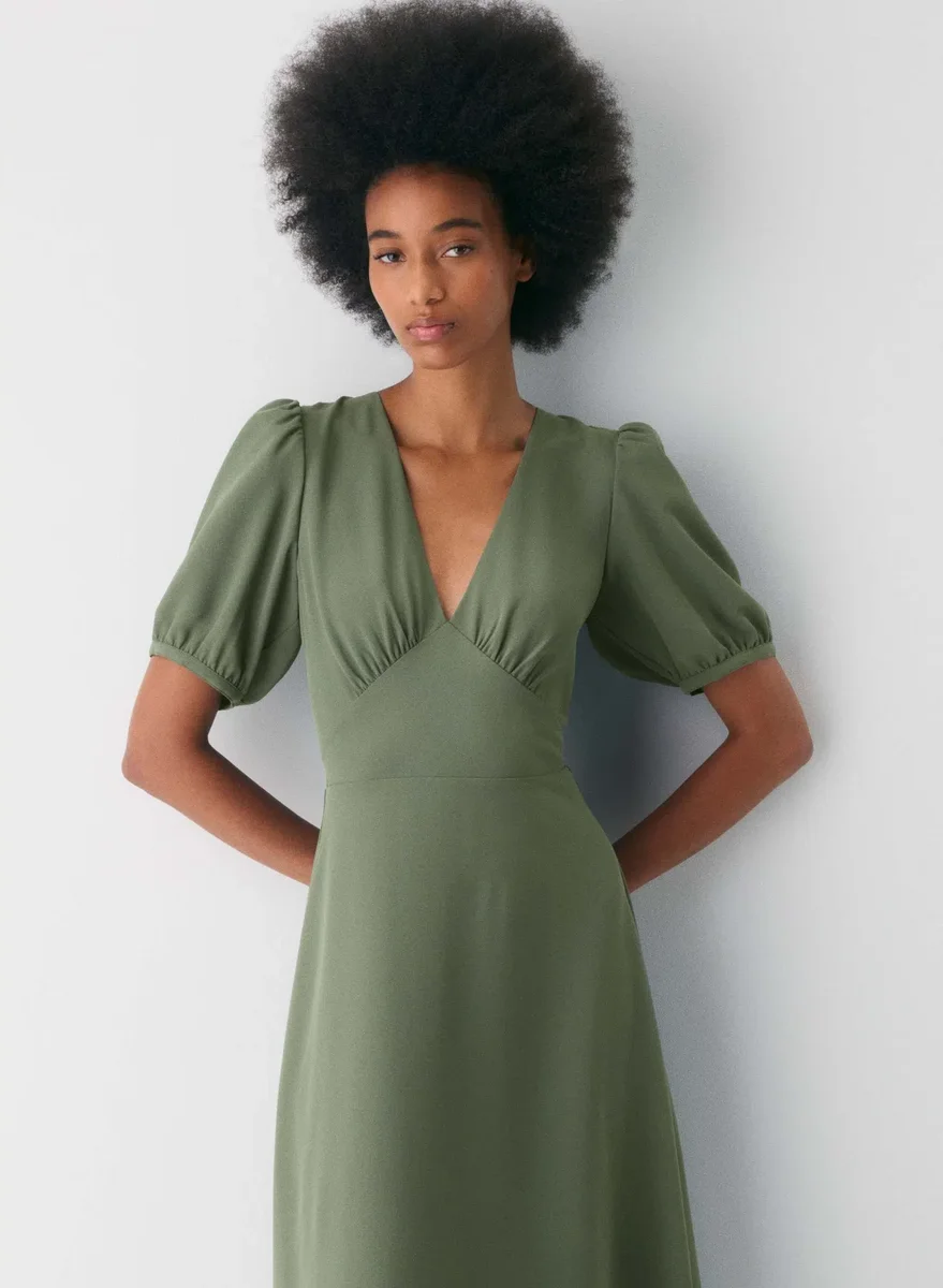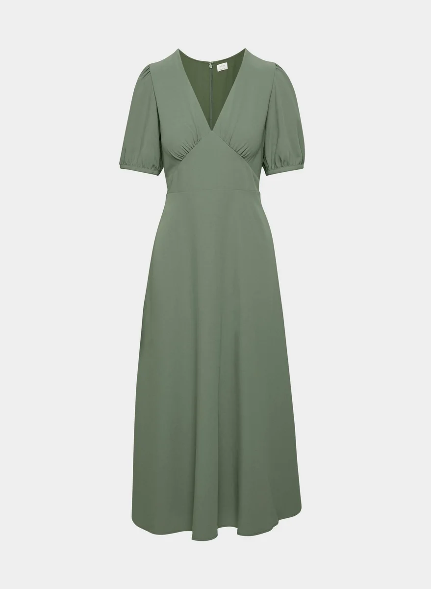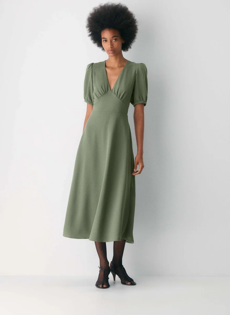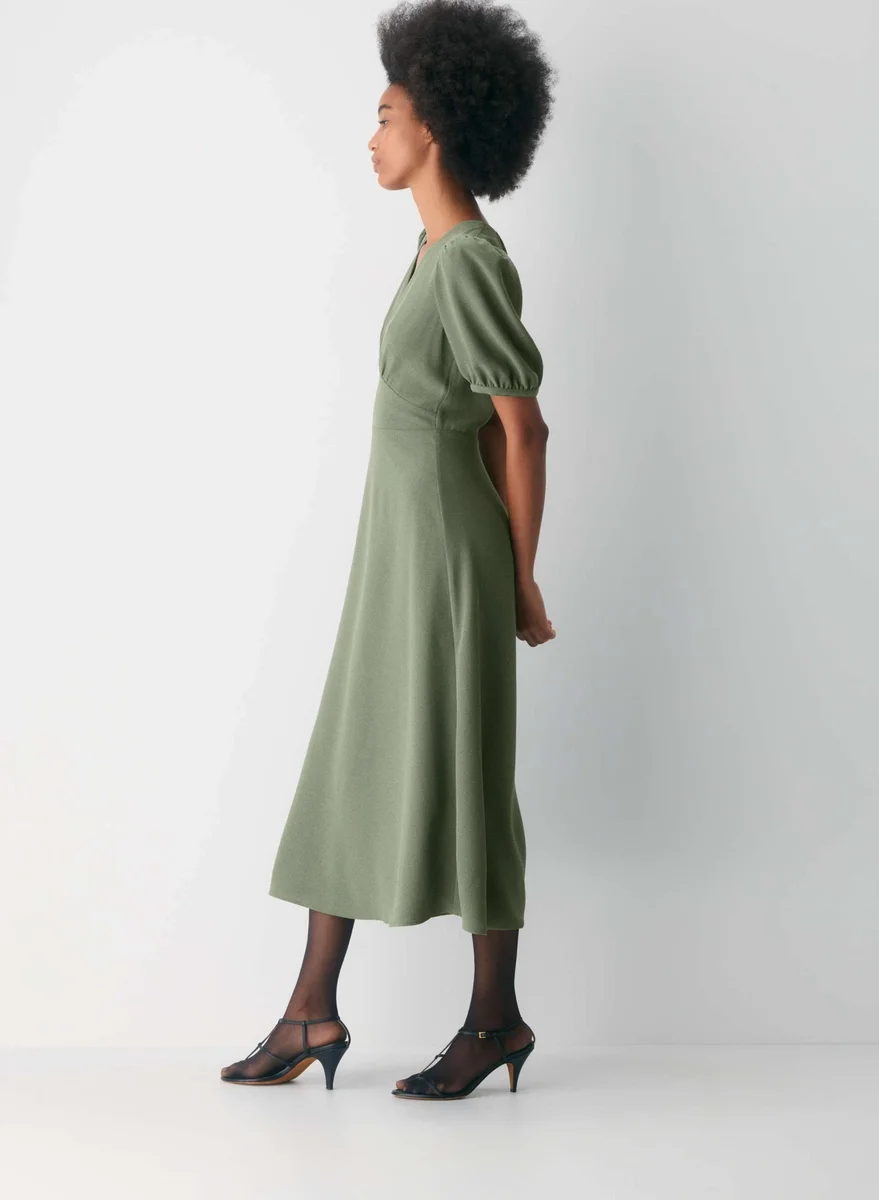 Pour virevolter Cette robe longue à col en V présente une silhouette ajustée et évasée. Elle est confectionnée en (Re)twill™, un tissu léger et aérien, d’une douceur incomparable.