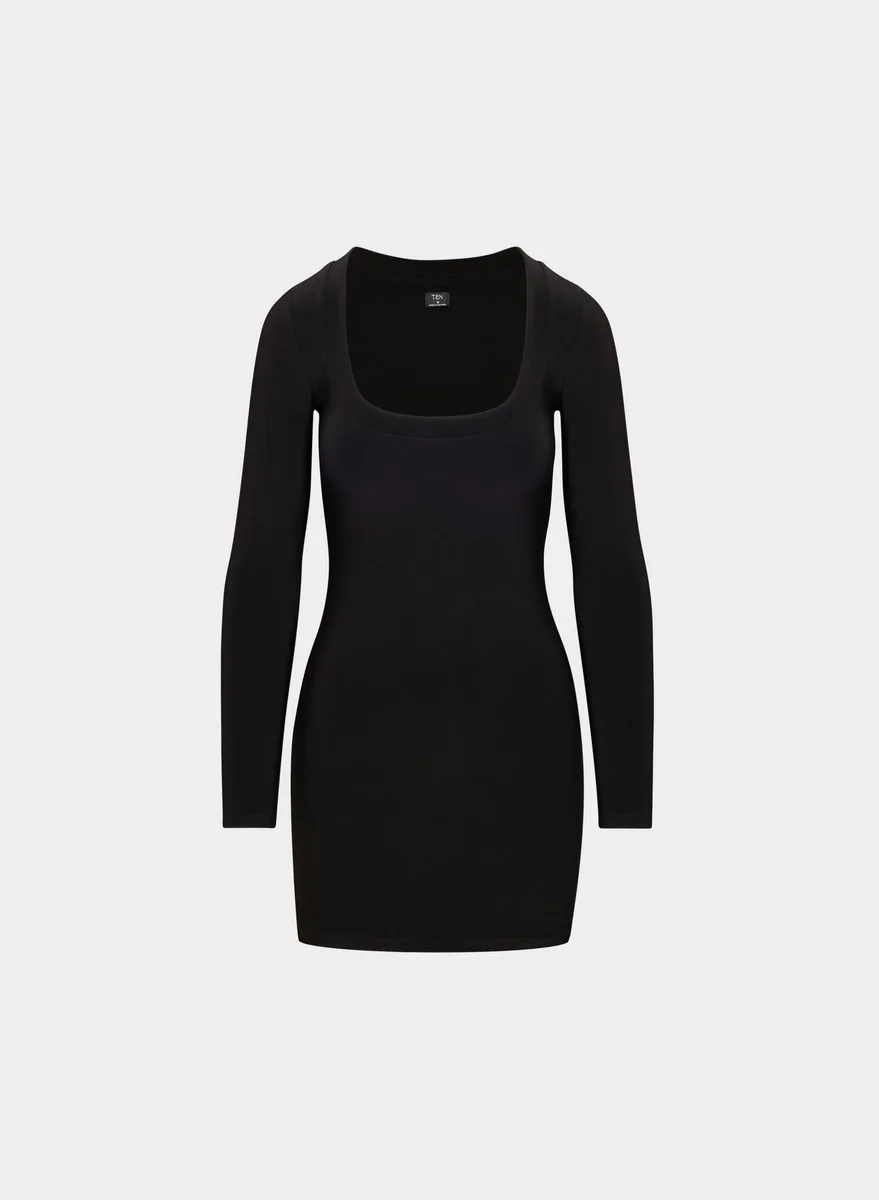 Cette mini-robe à encolure dégagée est conçue pour être ajustée. Elle est confectionnée en Smooth Matter™, un jersey extensible drapé au toucher luxueux et élégant et à l’éclat doux.